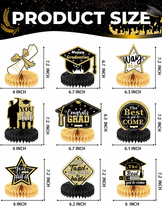 9Pcs Graduation Table Decorations 2025, Graduation Centerpieces for Tables, Black and Gold Honeycomb Centerpieces, 3D Congrats Grad Table Toppers for Class of 2025 Grad Party Decorations