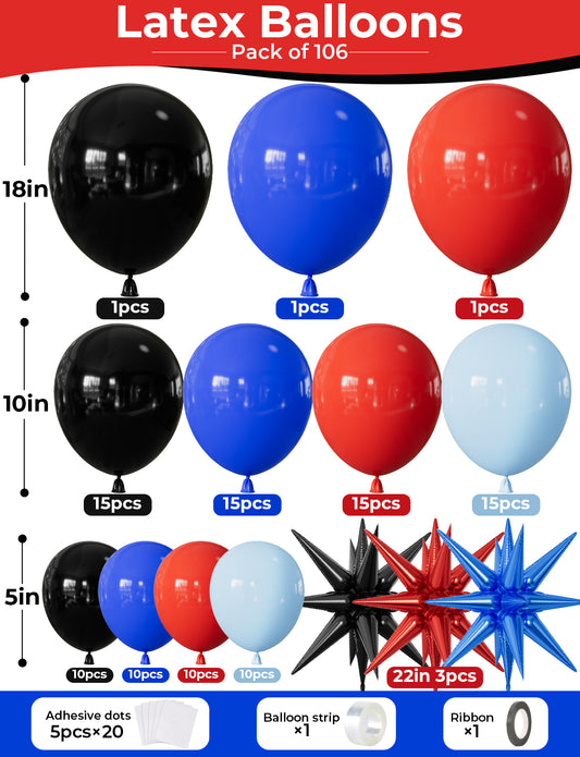 Black Red and Blue Balloons Arch Garland Kit, 106pcs Spider Theme Balloon Arch Kit with Starburst Foil Balloons, Hero-Themed Party Decorations and Birthday Backdrop for Boys