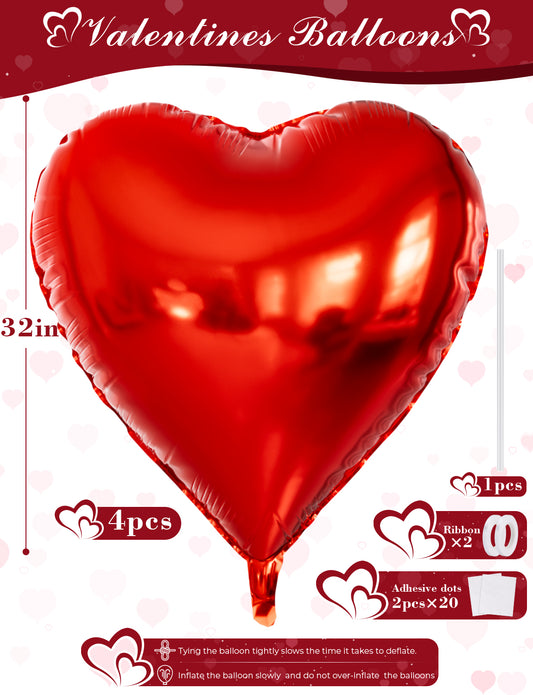32 Inch Red Heart Balloons, 4 Pcs Valentines Balloons, Large Red Heart Foil Balloons, Romantic Heart Shaped Balloons, Mylar Balloons for Valentine's Day Wedding Engagement Party Decorations