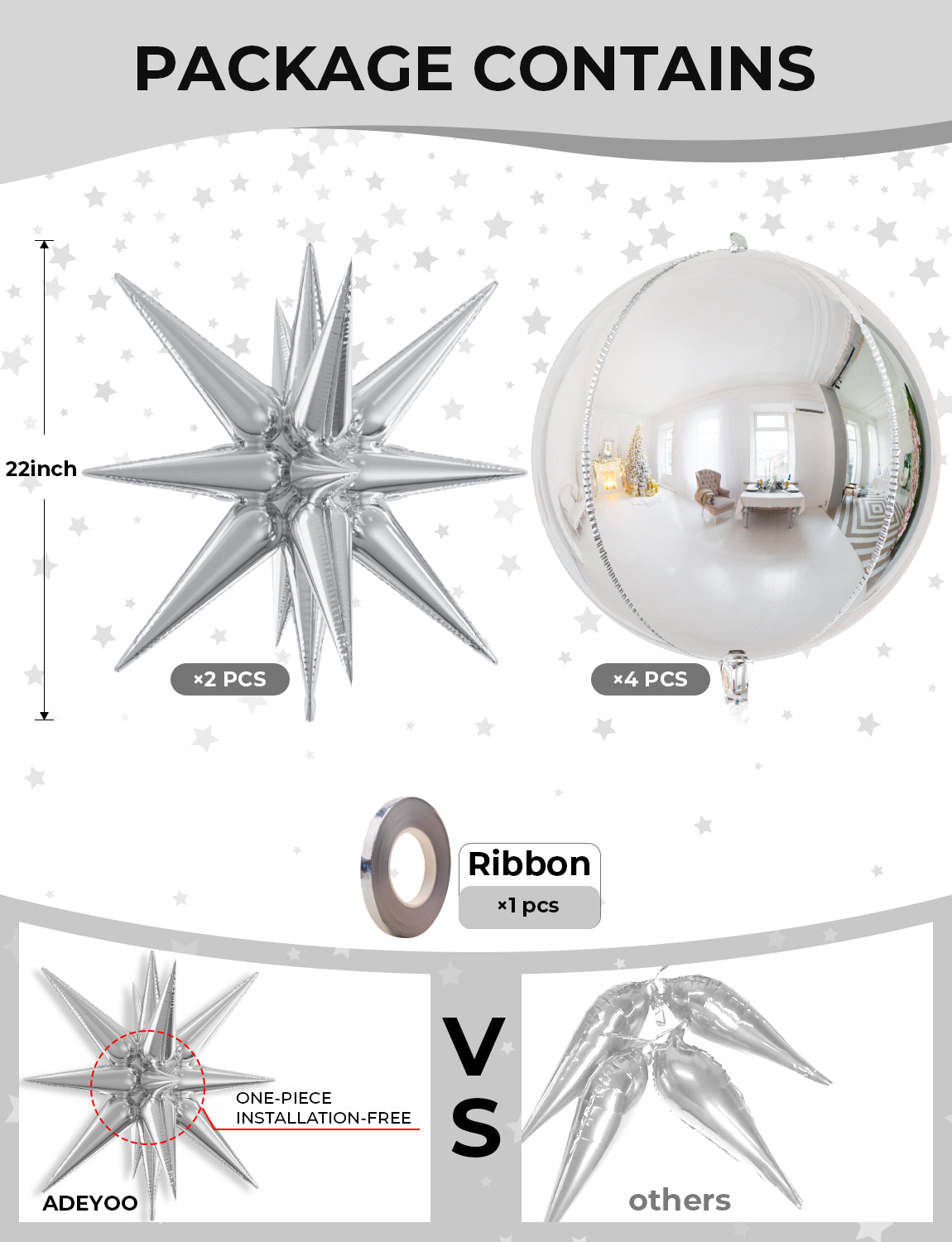 Haolongfa Silver Foil Balloons-22 Inch,4D Round Silver Mylar Balloons, Explosion Star Balloons, Metallic Silver Balloons for Birthday Party, Christmas Party Decor, Happy New Year Decor 6 Pcs