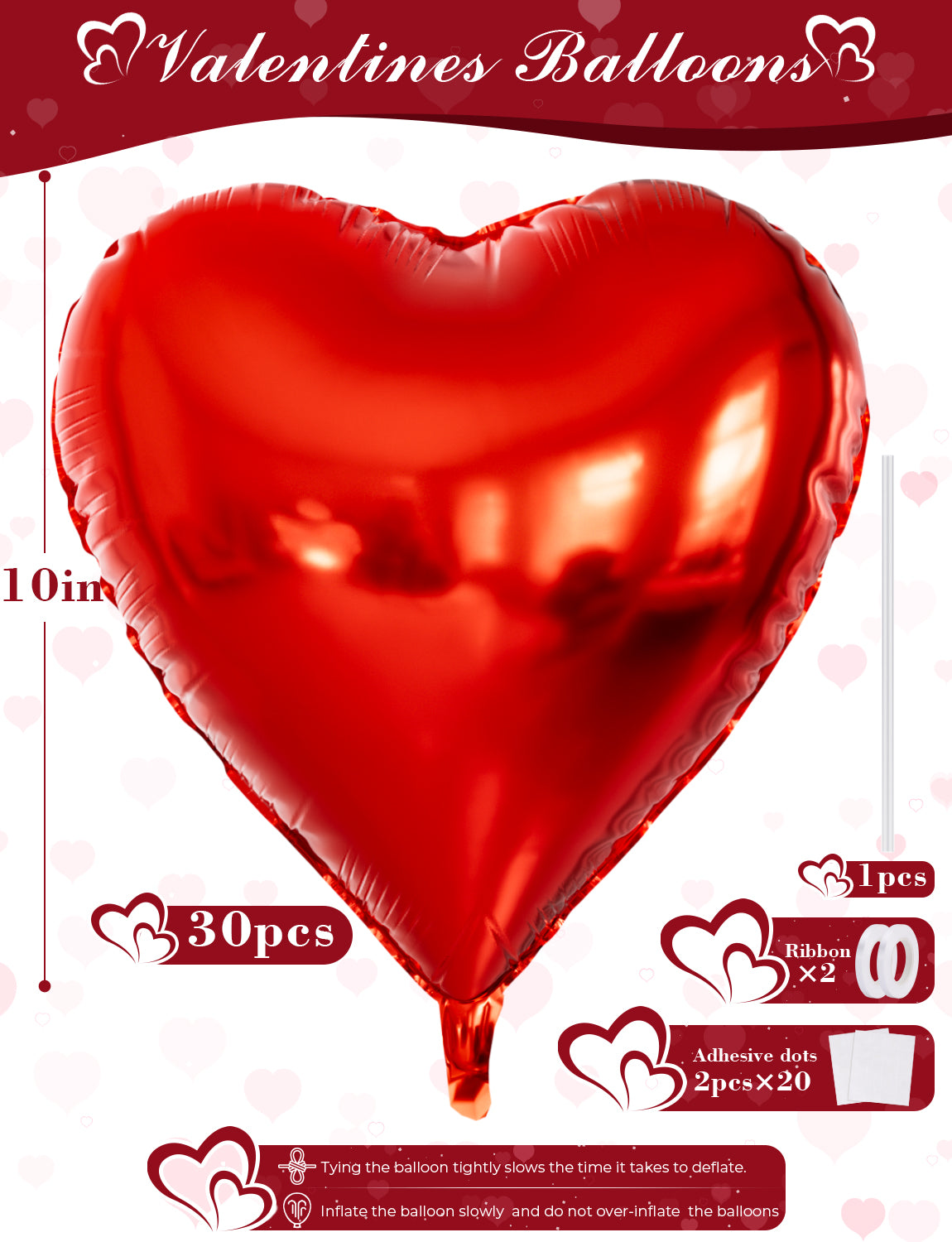 Haolongfa Valentine Balloons, 10 Inch Red Heart Balloons Kit, 30 Pcs Heart Shaped Balloons Mylar Foil Balloons for Velentines Day Anniversary Wedding Engagement Birthday Party Decorations