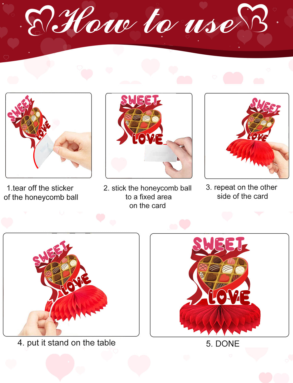 Our Valentines Day honeycomb table decoration is bright and colorful, with nine different designs, each one is extremely romantic. Made of high quality paper, light, waterproof, do not fade, can be used for a long time. These valentines day table decorations are also very simple to assemble, and you can easily decorate your room without spending a lot of effort and time. Perfect for Valentine's Day, engagement ceremonies, marriage proposals, weddings and more, it is a witness to your carefully prepared surprise, prepare a surprise for your lover