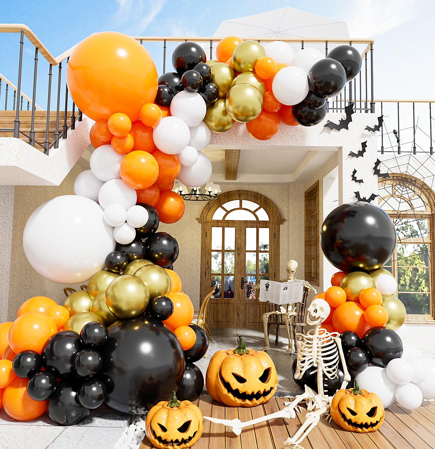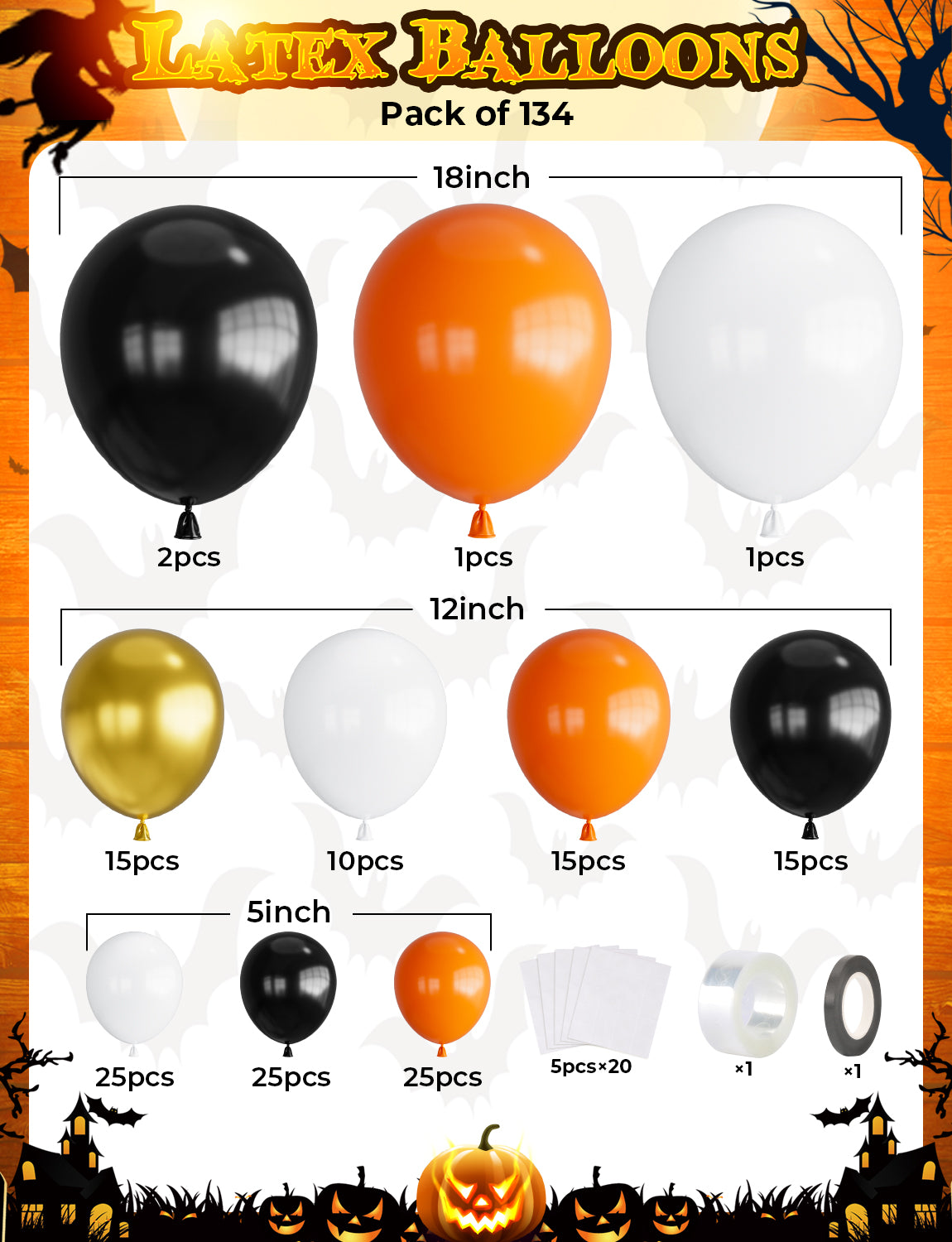- HALLOWEEN BALLOON ARCH KIT:Includes 134 halloween orange and black balloons in various sizes - black balloons (2pcs/18in,15pcs/12in,25pcs/5in),orange balloons (1pcs/18in,15pcs/12in,25pcs/5in),white balloons (1pcs/18in,10pcs/12in,25pcs/5in),gold balloons (15pcs/12in),1*balloon strip,1*black ribbon,100*adhesive dots.These halloween balloons add festive flair,perfect for halloween decorations.