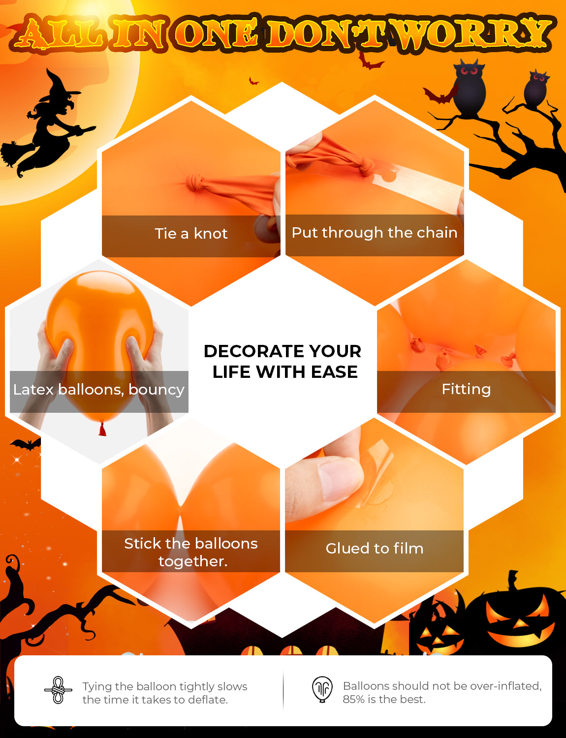 - SPREAD THE JOY:Help make some special days even more beautiful with these halloween party supplies that add a touch of vibrant and are sure to bring a smile.All our halloween orange and black balloons arch kit are shipped in vacuum packaging to prevent them from being oxidized during transportation.These orange and black balloons halloween balloons bring a touch of charm and creativity to your Halloween celebrations.
