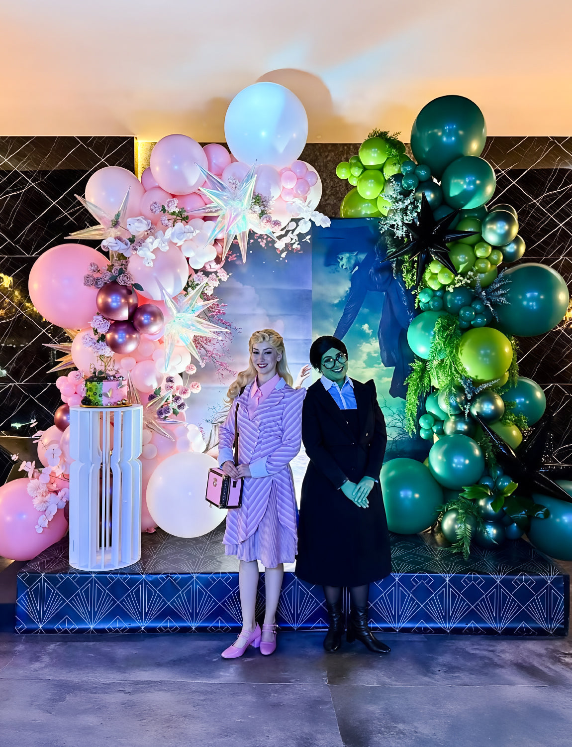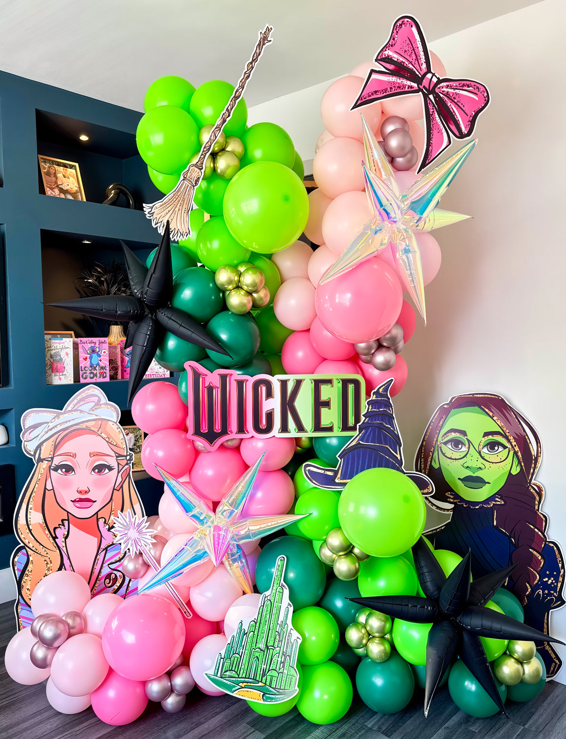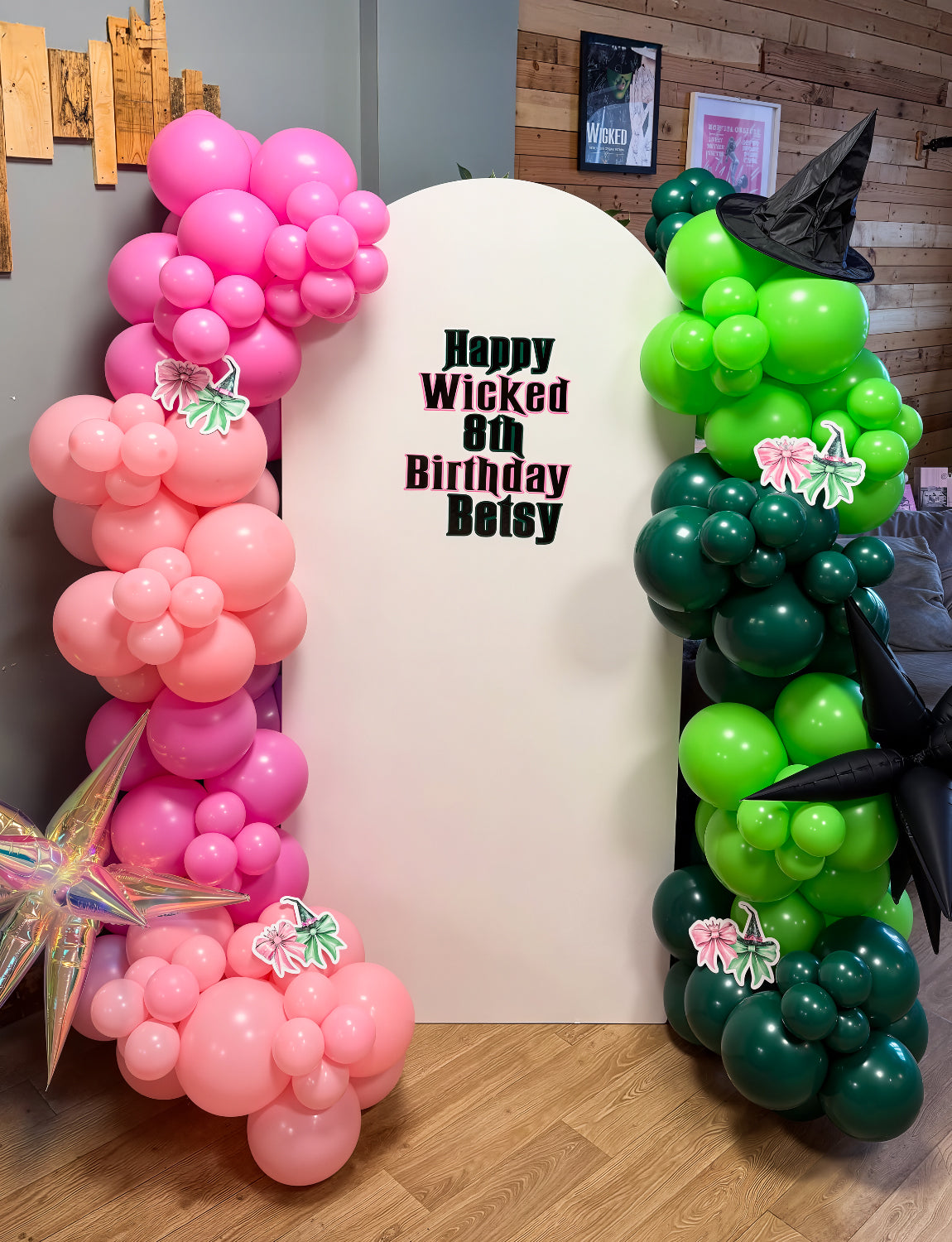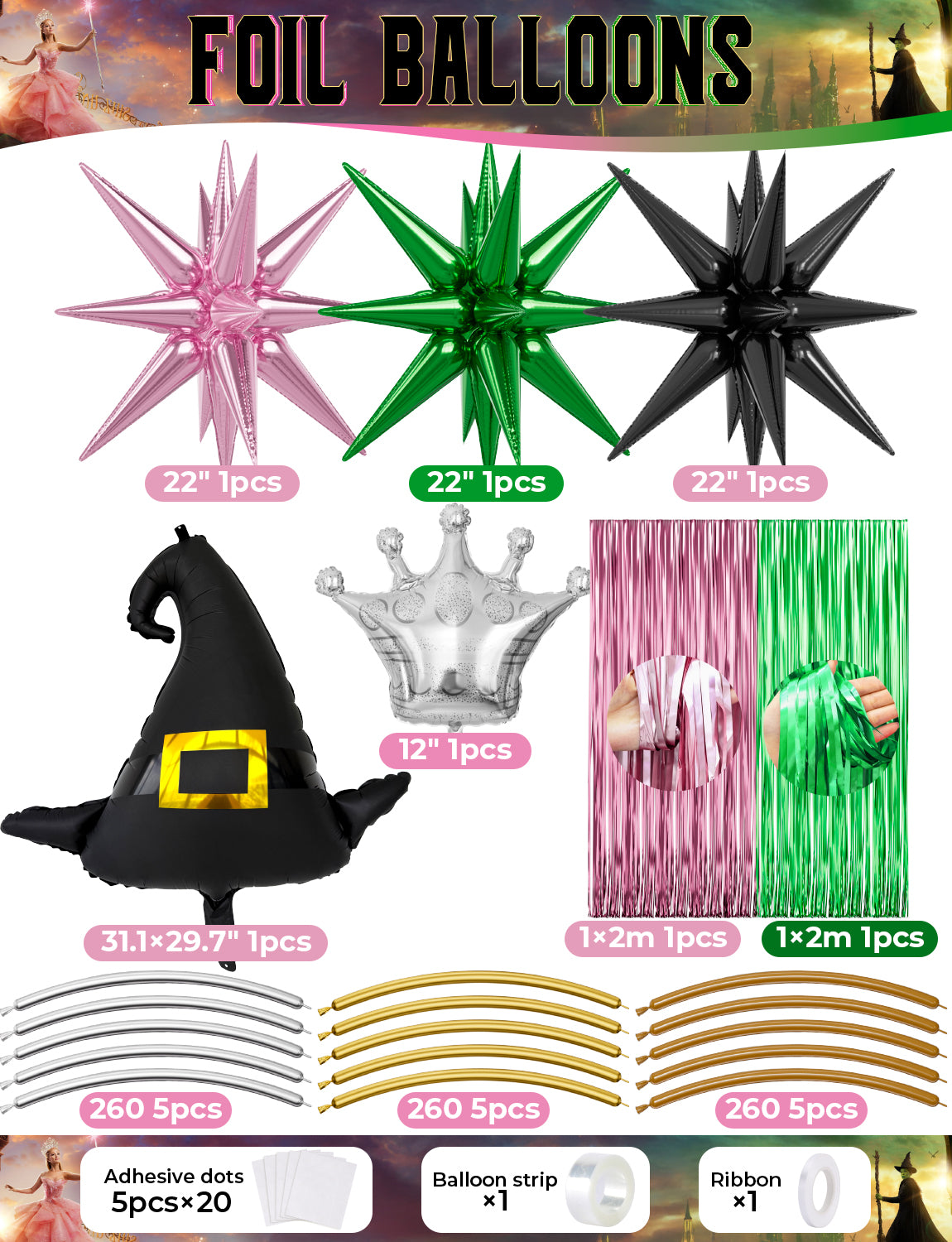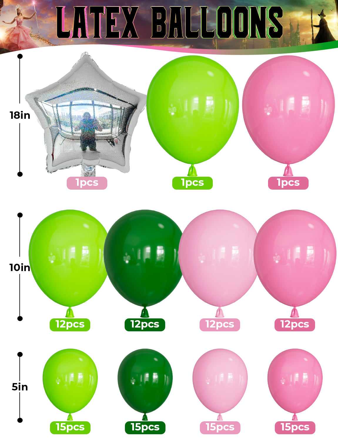 - Mesmerizing Green and Pink Balloon Arch - This 140 pcs wicked balloon arch kit combines high-quality different shades of green and pink latex balloons in 5in/10in/18in, 15 long balloons, 22" foil starburst balloons in magical pink/green/black hues, black witch hat balloon, silver crown balloon, star foil balloons and 2 shimmering tinsel curtain(1m*2m green/pink). It creates a perfect "Wicked" theme blend of princess charm and mystical vibes will bring you a memorable party sence.